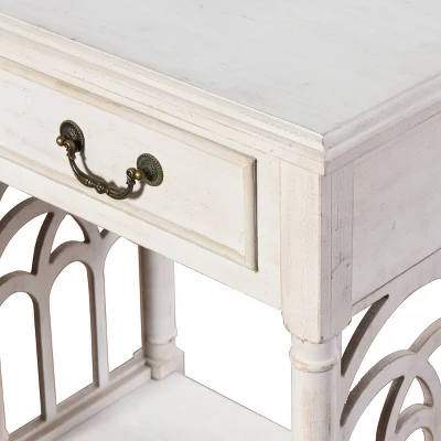 Enjoy a little extra storage and style in your bedroom or living room with this distressed white side table. Featuring a single drawer and bottom shelf with side detailing this piece is perfect to flank a couch or bedside. Constructed from MDF with veneer and fir wood, this side table will bring style to your space for years to come. Regardless if you put it in the bedroom or family room, this side table stands out. This will pair well with farmhouse styling and is sure to be a conversation piece. Due to lighting and monitor differences, actual colors and finishes may vary slightly from what appears online.