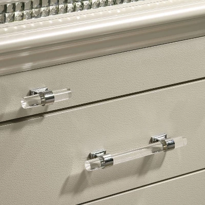 Jaws will drop at the sight of this glam and gorgeous two-piece bedroom set, featuring a nightstand and dresser. The pearl white finish makes this a glitzy addition to your sleeping space while bringing plenty of storage. An eight-drawer dresser is enhanced with crystal-like trim and bun style feet, with the same design carrying over to the two-drawer nightstand for plenty of aesthetic appeal.