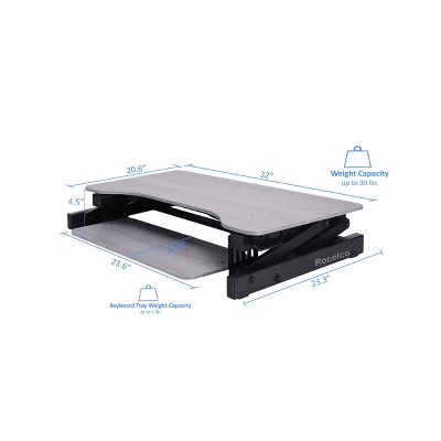 The ADR Standing Desk Converter gives you the best of both worlds. You can sit part of the day, as you always have, but you can also stand and take advantage of all the health benefits that come with standing and moving around. You, and your associates, will become healthier and more productive. Your ADR sits directly on top of your current desk…….so no need to buy all new furniture. The improved easy-grip side handle with gas piston assist, allows you to easily raise the large 32″ x 20.6″ desktop and keyboard tray into an infinite amount of position levels between 4.75″ and 16.75″ above your regular desk). The large top panel can hold 2 monitors or a monitor and a laptop. The ADR Sit to Stand Up Desk offers a large 23.6″ x 11.6″ retractable keyboard tray that not only allows you to get into the most comfortable and ergonomic position, but it is also large enough to hold a laptop computer (with other risers you may have to move the laptop or the entire riser every time you change from sitting to standing). It uses pneumatic gas pistons that allow you to easily raise or lower up to 30lbs. Fully assembled and ready to go!