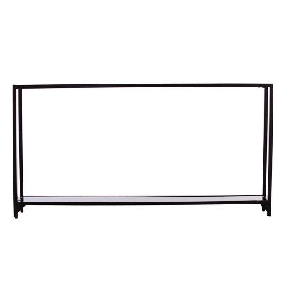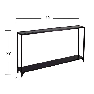 Display storage goes anywhere with the Aiden Lane Berton Narrow Metal Console. A long glass tabletop provides sleek display space for knickknacks and family photos, while the open shelf holds books or potted houseplants. The narrow profile slips easily behind your sofa or along a wall, maximizing small space storage in your home. Put your favorite items on display without sacrificing valuable space when you bring home this two-tier console table with glass.