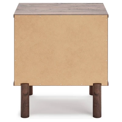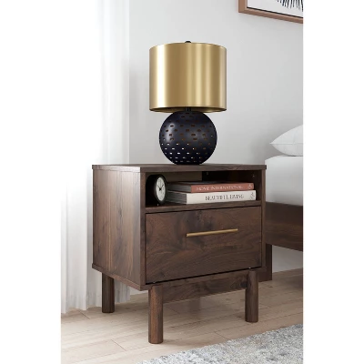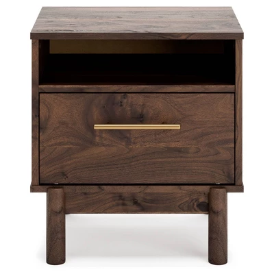 At the intersection of industrial cool and chic sophistication you’ll find this nightstand. With a rich brown finish over replicated walnut wood grain, paired with a burnished goldtone handle, it offers an authentic touch that plays well any way you style it. Simple and elegant in its design, this piece keeps your home decor grounded while elevating your modern style. Signature Design by Ashley is a registered trademark of Ashley Furniture Industries, Inc..