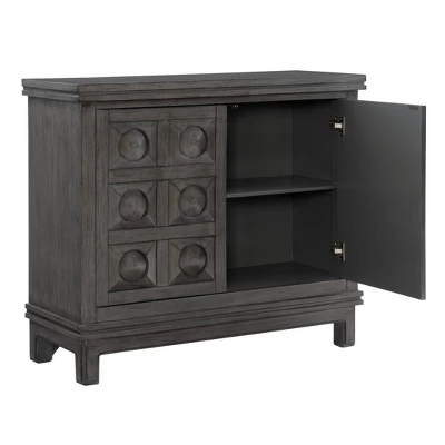 Dramatic raised and dimensional door fronts set this storage cabinet apart. In a rich, multi-step gray finish that provides an anchor piece for any room. Two large doors on hidden euro hinges, open to revel a fully finished storage area with a fixed shelf. Arrives fully assembled and ready to impress in a living room, dining room or entryway.