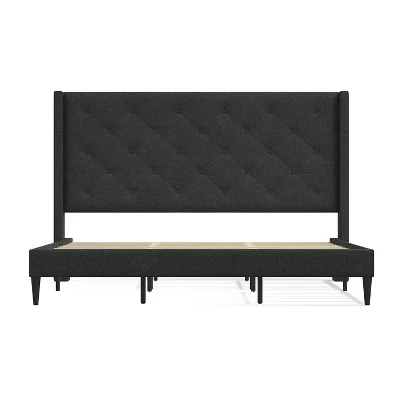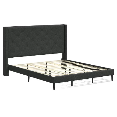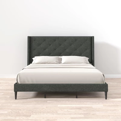 A simple, distinctive design blends traditional, mid-century, and modern styles in this striking upholstered bed. The elegant wingback headboard is accented with subtle button tufting for a comfortable, modern look that enhances any bedroom. Meticulously constructed with a solid frame made from composite wood, this bed adds comfort with high-quality upholstery foam wrapped in easy-to-clean polyester blend fabric. Solid legs in neutral black anchor the piece. Simple assembly means you will have your new bed set up in minutes – just add your mattress and bedding. Unlike many competitors’ beds, our quality, wooden slats are specifically designed to pair with nearly all mattress types, from traditional pocket-coil/innerspring to memory foam, gel, latex, and hybrid and more. No box spring required; Mattress sold separately; Choose from several elegant, designer colors of durable, easy-care, polyester fabrics