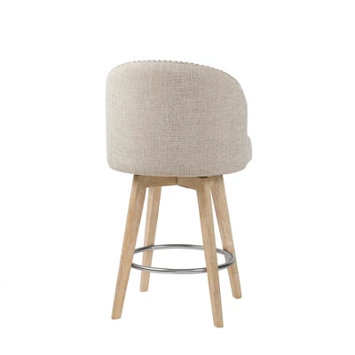 Add an exquisite transitional appeal to your dining area with the Madison Park Onyx Swivel Counter Stool. Designed in a barrel style, this counter stool is upholstered and accentuated by a button tufted back and a nail head trim, for an elegant touch. The straight, solid wood legs complement the upholstery, creating a beautiful coordinated look. A swivel base allows the counter stool to rotate 360 degrees, while the metal footrest provides sturdy support. With an exceptionally comfortable attached cushion, this swivel counter stool makes a stunning addition to any dining room. Assembly is required. Max weight capacity: 300 lbs.