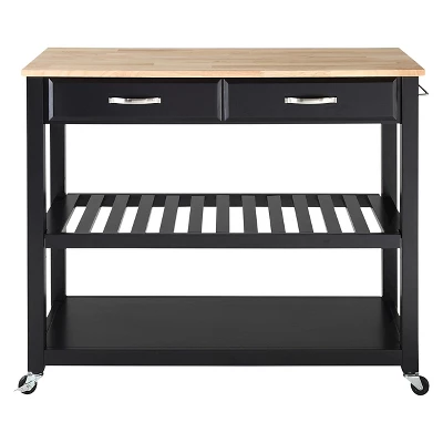 Create the culinary space of your dreams with a Natural Wood Top, Kitchen Cart/Island from Crosley. Constructed of solid hardwood with wood veneers and heavy-duty casters, this kitchen island is designed for longevity and portability. The stylish natural finish top expands your serving and countertop space while the built-in drawers and adjustable shelf offer much-needed extra storage. Raised panel detailing clean, sleek lines provides the ultimate in style to dress up any space. Style, function, and quality make this portable kitchen island a versatile, must-have addition to your home.