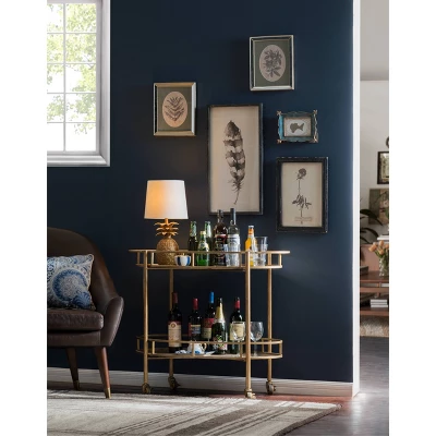 Our 1960s modern style cart goes for retro glam with its oval shape and paired rows of brushed gold metal barriers around each cart tray. Enjoy this serving cart in any room and move it from place to place with its convenient wheels. Don’t limit yourself to drinks; this cart can act as a side table, plant stand or convenient display table for collectibles.