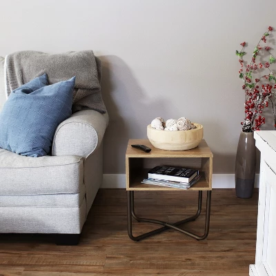 Add a touch of modern sophistication to the bedroom, living room, or office with this stylish bedroom nightstand table. Built from durable, medium-density particleboard (MDP), the finish is stain- and scratch-resistant to hold up to everyday wear and tear. It features a unique cross base with four powder-coated steel legs and a faux wood tabletop for an industrial-inspired look that will complement any decor. Plus, it has four protective PVC feet to prevent the metal from scratching the floor. The small end table for bedroom also features a convenient shelf to easily tuck away messy clutter items like remotes, magazines, and drink coasters. The open-faced design makes it easy to see the items inside and easily find them without searching the room. Whether placed next to a bed, chair, or sofa, this small accent table provides a convenient surface for a lamp, houseplant, radio, family photos, and much more.