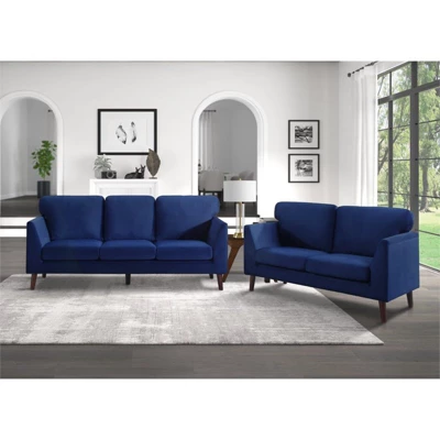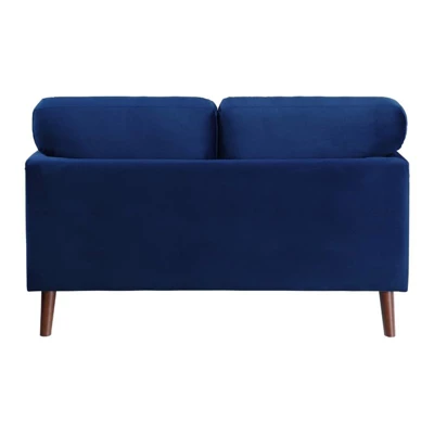 Created for a modern space, the Tolley Collection’s vibrant hue and streamlined profile will perfectly accent your home’s living room. The love seat is supported by dark brown finished wood legs that complement the blue velvet upholstered cover.Features : Solid wood and plywood frameFoam padding over pocket coilsVelvet fabric upholsteryReversible back and seat cushionsExposed wood feet with dark brown finishRemovable cushion covers with zipperAssembly requiredSpecifications : Product Dimensions : 35.00″ H x 58.00″ W x 32.00″ DSeat Width : 45″Seat Depth : 20″Seat Height : 19″Arm Height : 25″Product Dimensions : (Doorway width required) 20.5″Product Weight : 61.75 lbsWeight Capacity : 300 lbs per seat