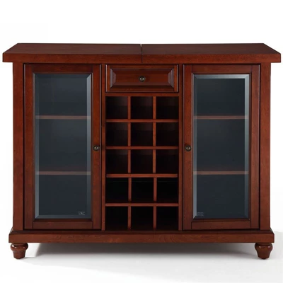 Elegantly entertain guests with this sliding top bar cabinet constructed of solid hardwood and wood veneers. The beautiful beveled/tempered glass doors and raised panel drawer front are classically styled to enhance any home decor. The sliding top expands to greatly increase the size of your serving area. Behind the two doors, you will find adjustable shelves and plentiful storage space for spirits, appliances and other items that require additional space. The center storage area is great for up to 15 bottles of wine, or if you prefer, remove the wine storage cubes to reveal an adjustable shelf. Style, function, and quality make this sliding top bar cabinet a wise addition to your home. Features:Sliding Expandable TopSolid Hardwood & Veneer ConstructionHand Rubbed, Multi-Step FinishBeveled / Tempered Glass DoorsAntique Brass Finish HardwarePlenty of Room for Storing Barware & SpiritsDoubles as a Serving Station when EntertainingAdjustable Levelers in LegsConstruction Material: Solid Hardwood and Wood VeneersSpecifications:Overall Product Dimensions: 36″ H x 47.75-64″ W x 20″ DProduct weight: 220 lbs.
