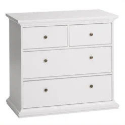 Sonoma 4 Drawer Chest offers space saving alternative that can hold a variety of items in its four drawers (2 small top drawers & 2 large bottom drawers), from guest linens to daily entryway necessities. The unique depth makes this piece an ideal addition to bedrooms, living areas, or entryways. Adorned with top and bottom molding, rounded bronze colored metal hardware, metal drawer glides and a fade resistant foil surface that is easy to clean this unit brings out a romantic flair while still functioning as an organizational hub for your living area. Combine the Sonoma 4 Drawer Chest with coordinating Sonoma items to complete the look.Features : Contemporary design that provides a modern and cohesive ambienceTwo small top drawers and two large bottom drawers provide ample storage, Drawers retract smoothly on metal glides with built-in safety stopsTop and bottom moldingBronze colored round metal handlesUse in the entryway, office, living room or child’s roomProduct is shipped in 2 boxesSuggested number of people for assembly is 2Made from engineered woodMade in DenmarkScandinavian look and designIncludes assembly manual and all necessary hardware and fasteners. Components are pre-drilled and pre-cut ready for easy assembly!Specifications : Product Dimensions : 34.25″ H x 37.75″ W x 19″ DTarget Audience : Adult (18 Years and Up)Number of Drawers : 4Furniture Subtype : Horizontal DressersProduct Weight : 107.58 lbs